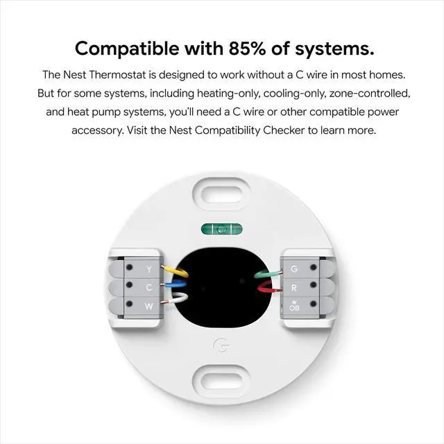 2. The Nest Thermostat is designed to work without a C wire in most homes, but for some systems, including heating only, cooling only, zone controlled, and heat pump systems, youll need a C wire or other compatible power accessory. Lock feature: No