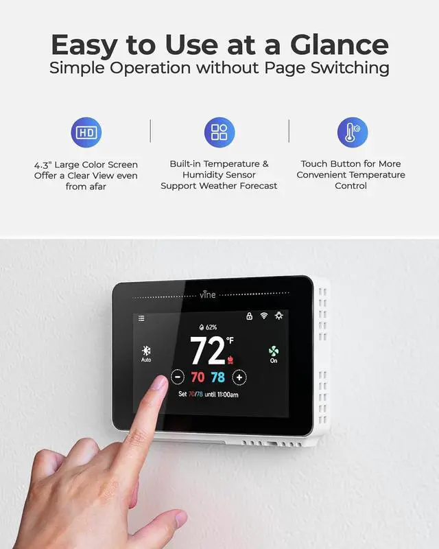 Crisp Touchscreen & NightlightEnjoy an exceptional viewing experience on the 4.3" large touchscreen, and features a gentle night light function, this smart thermostats for home ensuring perfect visibility whether in bright daylight or dark rooms, all while being incredibly user-friendly