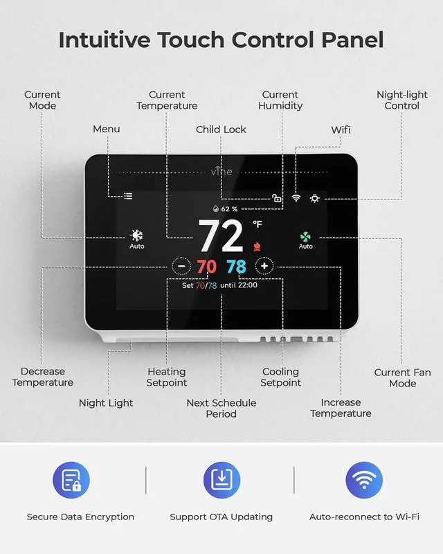Multi-Smart Features Features data encryption security, support OTA, Wi-Fi auto reconnect, fan Control and weather forecasting functionality, our home thermostat for ac and heating ensuring your convenience and peace of mind in daily life