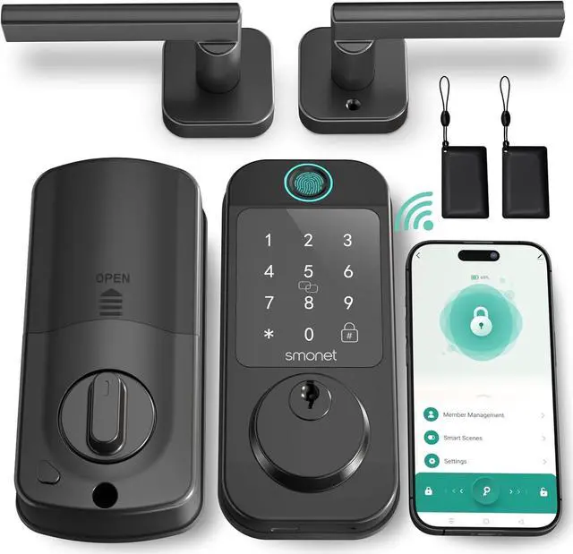 Keyless Door Lock with Handle Set - SMONET WiFi Fingerprint Smart Locks for Front Door, App Remote Control, Digital Bluetooth Keypad Deadbolt Lock Set with Alexa, Auto Lock, Code, Fobs for Home Black