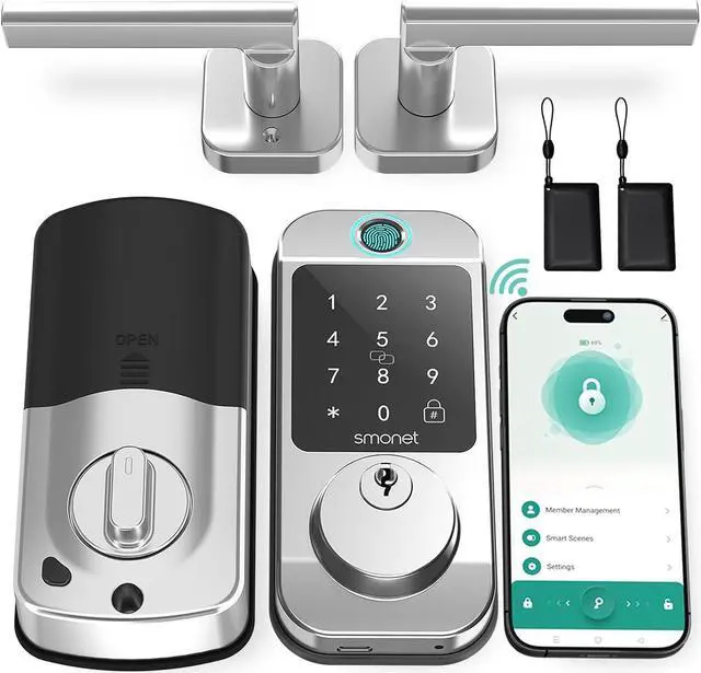 WiFi Door Lock with Handle Set - SMONET Fingerprint Smart Locks for Front Door, Deadbolt Keypad Bluetooth Digital Lock Set with Alexa, App Remote Control, Auto Lock, for Home Silver