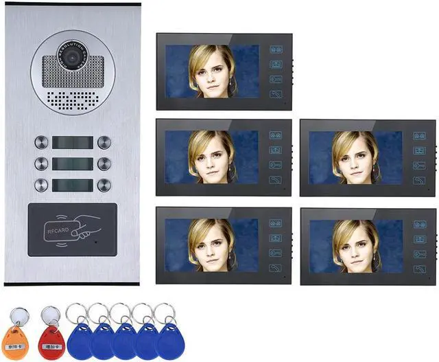 Touch Button 7" 5 Apartment/Family Video Door Phone Intercom System RFID IR-CUT HD 1000TVL Camera Doorbell Camera with 6 button 5 Monitor Waterproof