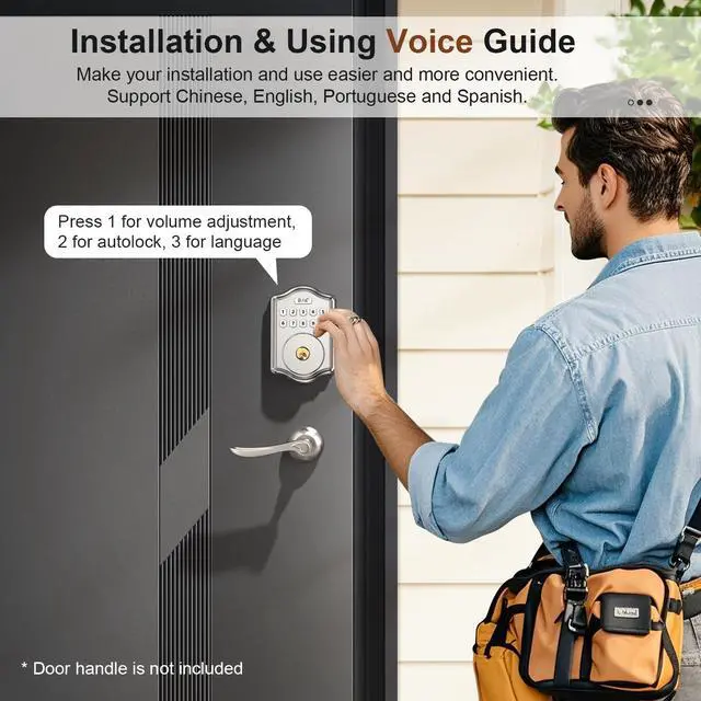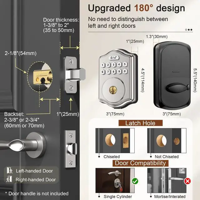 - Easy to Install: This upgraded 180° design smart door lock compatible with most standard US left handed and right handed doors, which can be automatically identify left and right doors, no manual settings required. Voice navigation function which supports multiple languages makes your installation and use more convenient and simple.