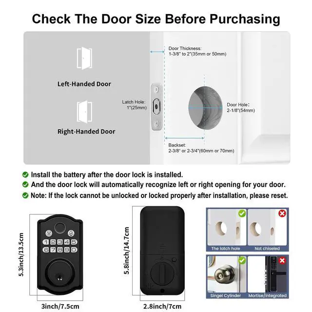 Convenient Keyless Entry Door Lock: The smart door locks for front door offers a convenient keyless entry solution, fingerprint recognition, smartphone app, customizable codes, or a traditional mechanical key. This smart lock is perfect for various settings, including homes, commercial, properties, apartments, and offices Easy Installation: This smart deadbolt lock fits for backset size: 2-3/8or 2-3/4"(60mm or 70mm), you can adjust it as your needs. Our keypad door lock recommended for wooden doors, but not compatible for metal door, rim cylinder, mortise and integrated. Easy to install this smart lock in minutes with a screwdriver for most US standard doors.