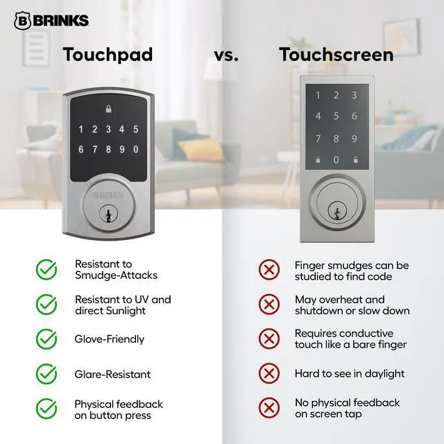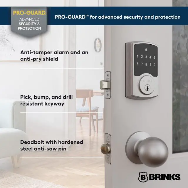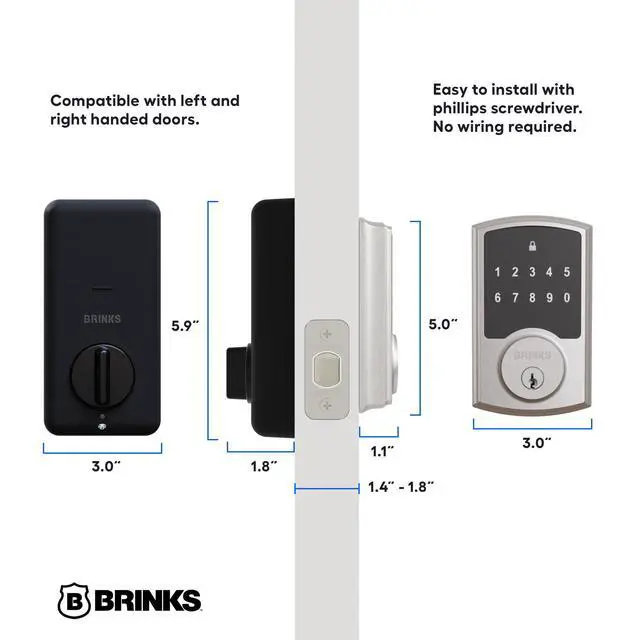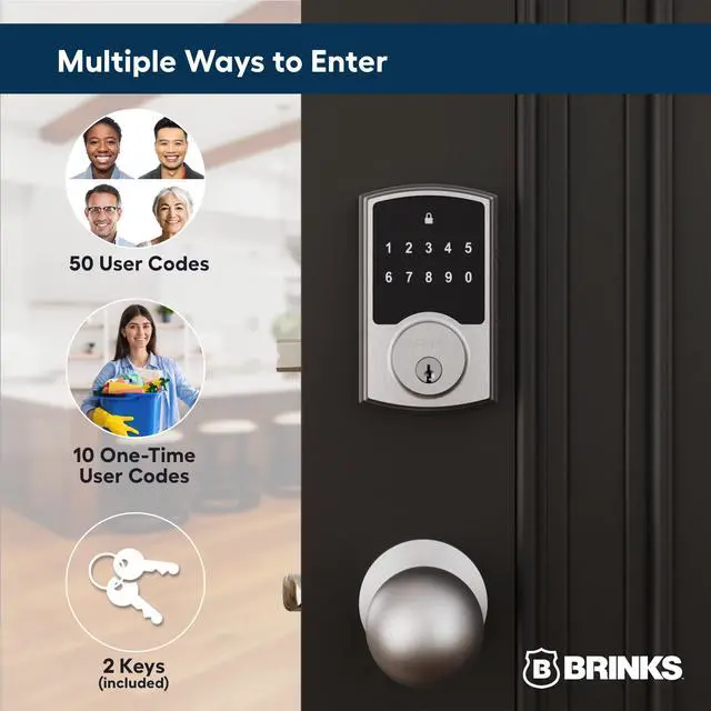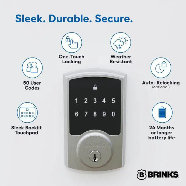 The Brinks Keyless Entry Electronic Touchpad Deadbolt offers a sleek, modern design with a backlit touchpad for easy, keyless entry day or night. It allows you to program up to 50 user codes and 10 one-time codes for flexible access, plus includes 2 mechanical spare keys for traditional entry. Built with advanced security, the lock features an anti-tamper alarm, anti-pry shield, pick-resistant keyway, and a 1-inch deadbolt with a hardened steel anti-saw pin for maximum protection against tampering and break-ins. Powered by 4 AA batteries (included), the lock lasts up to 2 years, offering 2x longer battery life than many competitors. Easy to install with no wiring required, it fits most doors (1-3/8" to 1-3/4" thick) and includes an adjustable latch for 2-3/8" or 2-3/4" backset, making it ideal for both right- and left-handed doors. Whether for front doors, offices, or any entryway, this lock combines keyless convenience, high security, and stylish design for your home or office.