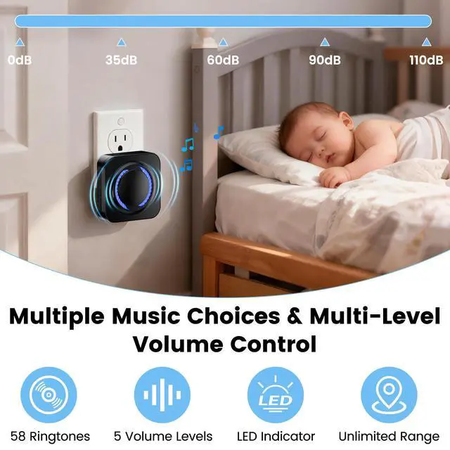 *5 Volume Level: Four volume levels (35–110dB) adjustable via the doorbell buttons. 0dB silent mode is set the alert mode to "Light" in the Alexa app.