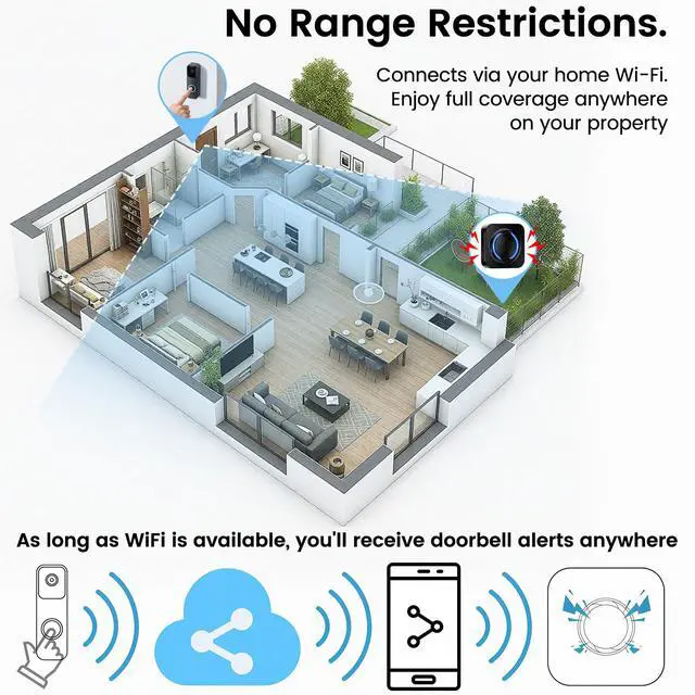 Connect via your home Wi-Fi. Enjoy full coverage anywhere on your property. You can also add 99+ doorbell extenders to install in bedrooms, basements, garages, attics, and more—each can be assigned a unique name for easy identification.