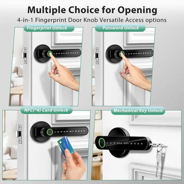 • 4-IN-1 Smart Lock: Fingerprint + Password + 2 Mechanical Keys +4 IC Card; Our door lock provides add up to 100 fingerprints and 50 passwords to suit different family members and guests