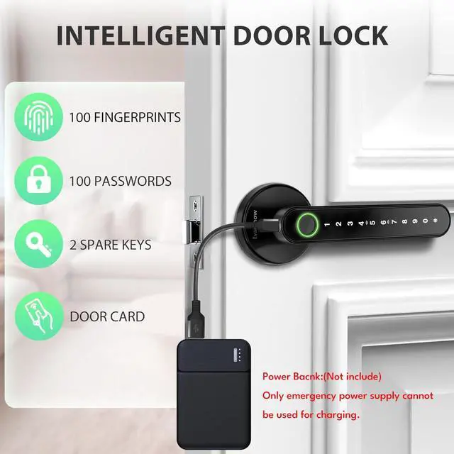 • Important First-Step Setup:Before first use, you MUST register an administrator fingerprint. Until an admin is set, ANY fingerprint will be able to unlock the door.The door lock have a USB port for emergency power (using an external power bank), but it cannot be used to charge the lock's internal batteries.