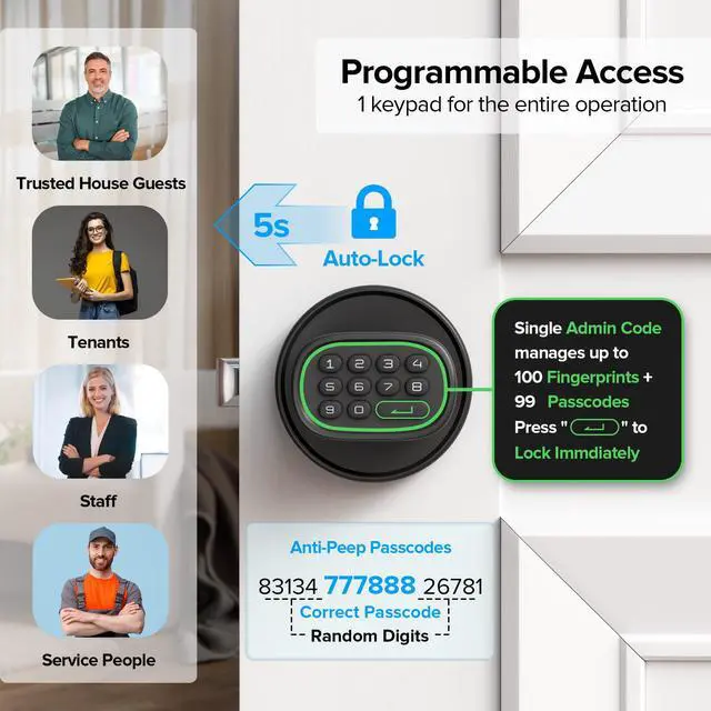| Fingerprint, Keypad, Key | Fingerprint, Keypad, Key | All above, Voice, App, Remote | All above, Voice, App, Remote | All above, Voice, App, Remote | Keypad, Key |