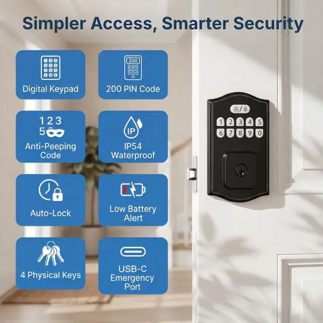 Keyless Convenience for the Whole Household: Never fumble for keys again. This keyless entry door lock supports up to 200 unique user codesperfect for family, friends, or frequent guests. It includes 4 physical backup keys, ensuring you always have reliable access to your home. An ideal front door lock set keyless entry solution that combines modern technology with traditional backup.