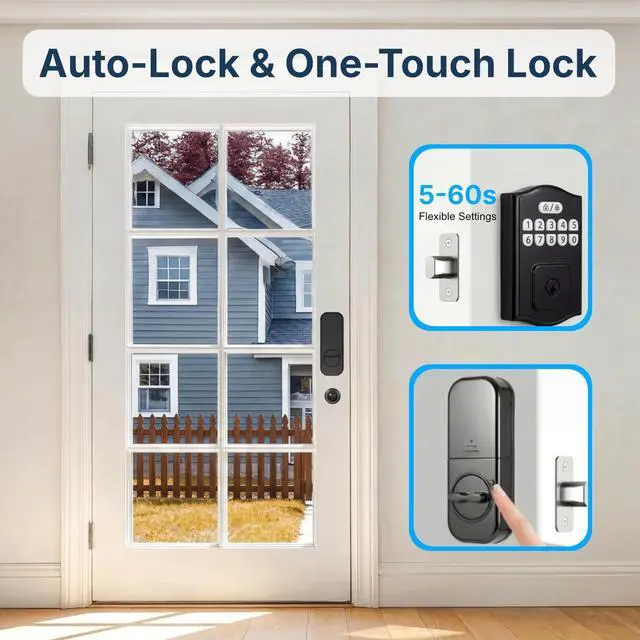 Automatic Locking for Added Security: Enjoy true peace of mind with our auto-lock feature. Customize the timing from 5 to 60 seconds based on your routine, or press and hold one button for instant locking as you leave. This front door lock actively helps protect your home by ensuring it's always securely locked behind you.