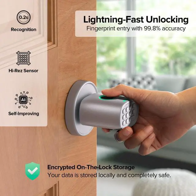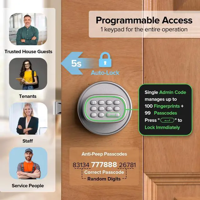 | Fingerprint, Keypad, Key | Fingerprint, Keypad, Key | All above, Voice, App, Remote | All above, Voice, App, Remote | Keypad, Key |
