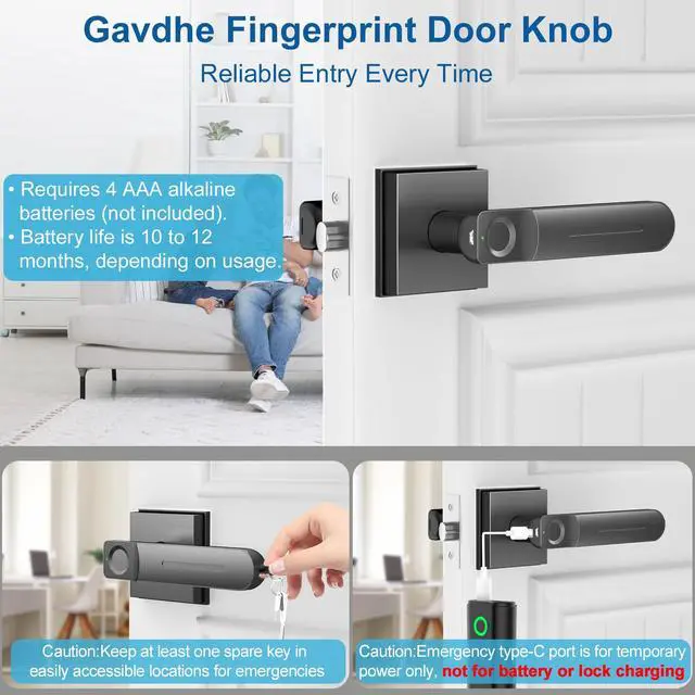 - Battery: Use four AAA alkaline batteries (not included) for best performance. Rechargeable batteries are okay, but do not charge the lock or the batteries via Type-C port or DC wall output to avoid damage.