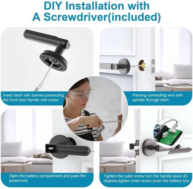 Replacing the ball door knob or old door lever with smart door knob directly and you can install fingerprint door lock in 15 minutes by yourself with a screwdriver(included) only