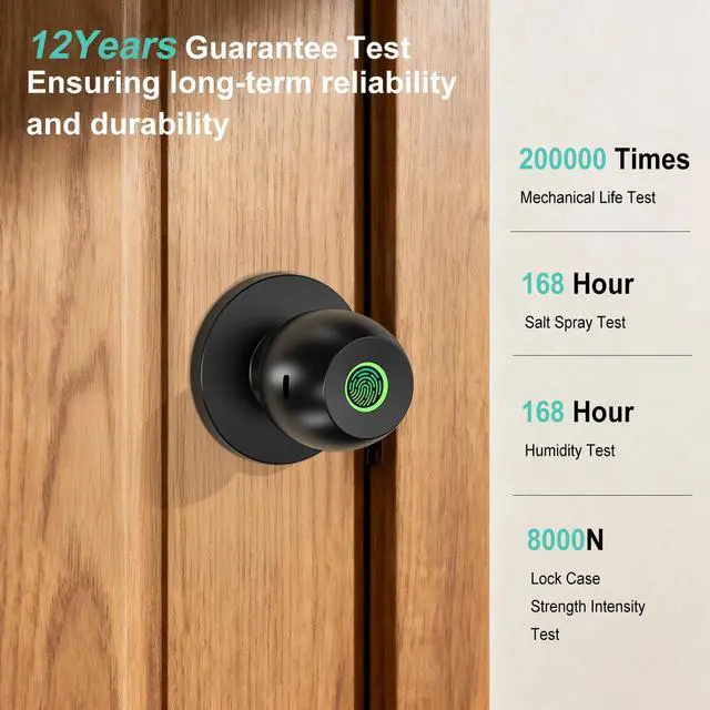 3 Unlock Ways & One Touch Lock52HZ fingerprint door knob with lock offers 3 unlocking options: fingerprint recognition (20 fingerprints), app control (remote within Bluetooth range), and mechanical keys for emergencies, locks automatically upon closing. This fingerprint door lock provides fast and secure keyless entry for your family, visitors, and apartment tenants, giving you peace of mind when you're away.