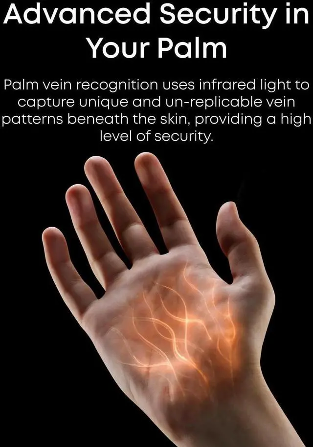 Advanced Security with 99.99999% Accuracy. Achieve recognition in just 0.1 seconds with secure, forgery-proof palm vein technology. This feature ensures maximum security based on your palm's unique vein patterns. Your palm vein data is stored locally on the lock, keeping your privacy entirely in your hands.