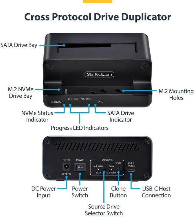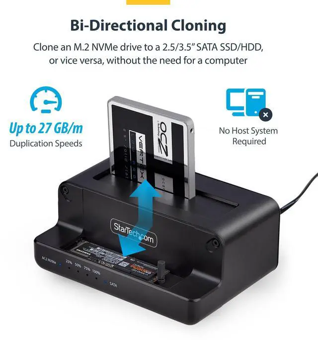 - STANDALONE BIDIRECTIONAL CLONING: Copy an M.2 NVMe drive to a 2.5/3.5" SATA SSD/HDD, or clone from a SATA drive to M.2 NVMe without the need for a computer; Up to 27GB/min sector-by-sector duplication copies the entire drive; Works with any file format
