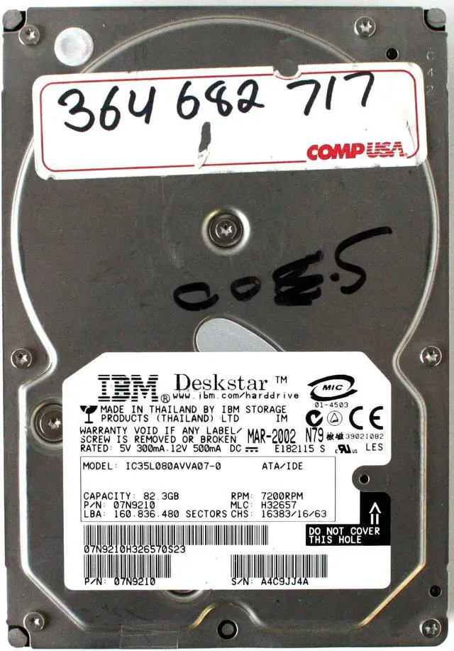 IBM 82.3GB HDD, DESKSTAR IC35L080AVVA07-0, 07N9210 7200RPM MLC: H32657