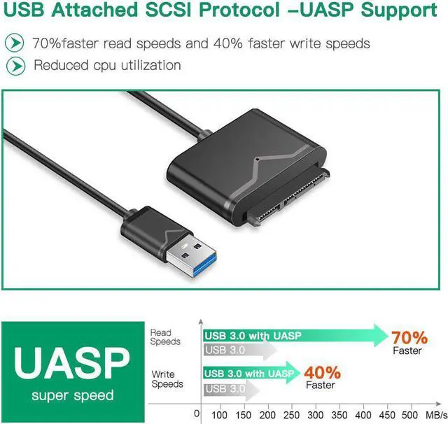 The USB 3.0 to SATA adapter cable lets you connect any 2.5'' or 3.5'' SATA drive and HDD drive to your computer through an available USB port -- the easiest way to upgrade the hard drive in your laptop by adding an external SSD via USB 3.0.