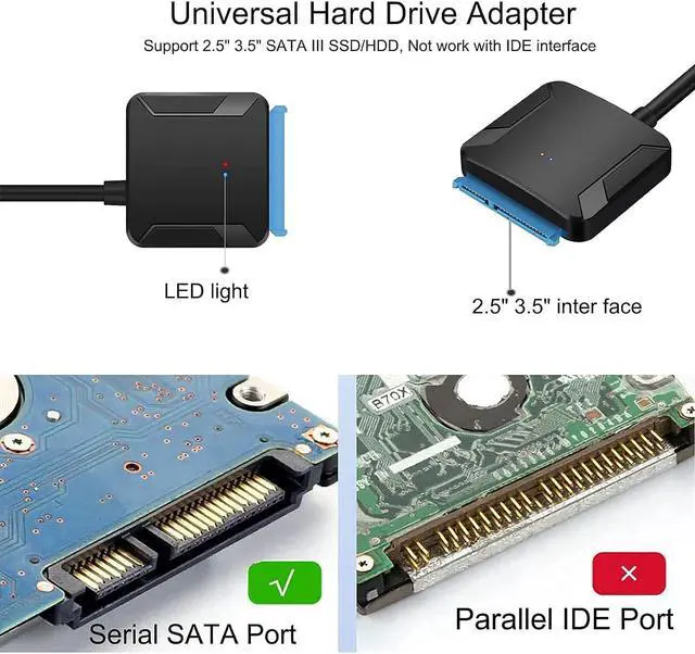 - SATA 15+7 Pin Female Connection: 2.5" SATA III / II / I HDD and SSD, compatible with W-D Blue PC Hard Drive, WD Black 3.5", W-D Green SATA 3, Sea-gate Barracuda 3.5/2.5, Se-a-gate IronWolf, Tos-h-iba P300 3.5", Se-ag-ate Fire-Cuda, Sa-m-sun-g 860 EVO / 850 EVO SATA III, Cru-cial BX500, Kin-gst-on SATA A400, PN-Y CS900, TCS-UNBOW / Sil-icon Power / DREVO / YU-CUN internal Solid State Drives, etc.