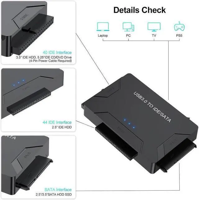 Universal USB Hard Drive Adapter: Sata and ide to usb 3.0 adapter supports 2.5" / 3.5" HDD/SSD, 2.5" / 3.5" IDE, 5.25" DVD-ROM, CD-ROM, CD-RW, DVD-RW, DVD + RW Optical Drive; Hard drive converter is retrieve old files, backup, cloning and data recovery device tools. This converter allowing connect to 3 hard disk drives simultaneously.