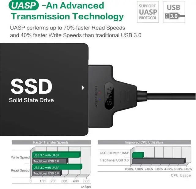FAST TRANSFER SPEEDS UP TO 6GBPS WITH UASP: The SATA to USB adapter supports USB 3.0 data transfer speeds of 6Gbps, 70% faster than conventional USB 3.0 when connected to a computer that also supports UASP, Reverse compatible with USB 2.0 & USB 1.1