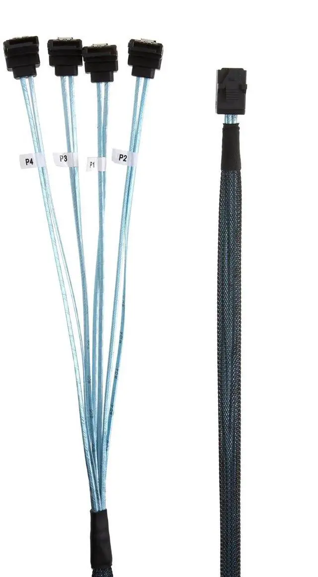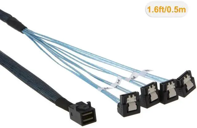 Specifications Side 1: Mini SAS (SFF-8643) Male with Latch Side 2: Angle 4x SATA Female Port Cable: 30AWG Cable Length:0.5M Cable Color: Black+Blue SFF-8643 Connect to Controller, 4x7Pin Sata Connect to SATA hard drive