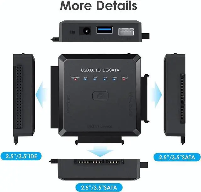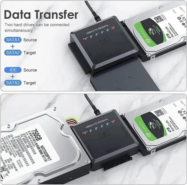 Universal SATA IDE Hard Drive Adapter: Support SATA 2.5" / 3.5" HDD; 2.5" / 3.5" IDE HDD, DVD-ROM, CD-ROM, CD-RW, DVD-RW, DVD +RW Optical Drive; It can support the simultaneous connection of 2 HDDs for retrieve old files, backup, cloning and upgrade for a speedy transfer - IDE Source+SATA2 Target; SATA1 Source+SATA2 Target