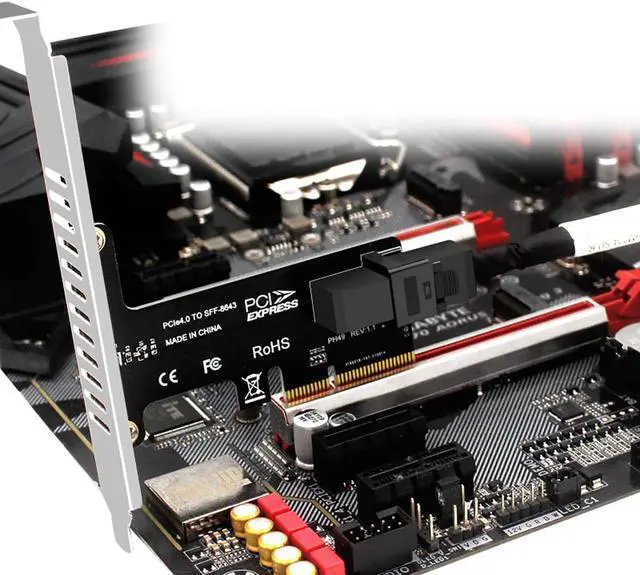 PCI-E X4 to SFF-8643 connection: PCI-E X4 to SFF-8643 interface needs to be used with U2 cable(Do not include).