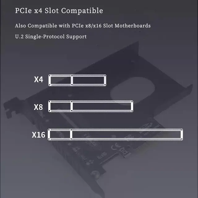 This U. 2 adapter card is fully compatible with U. 2 protocol SSDs, offering single protocol stability and efficiency. It supports PCIe X4/x16 slots and can also be installed in PCIe X8 and X16 slots, making it flexible for different types of motherboards. The solid build and gold plated contacts ensure consistent performance and durability for long term use.