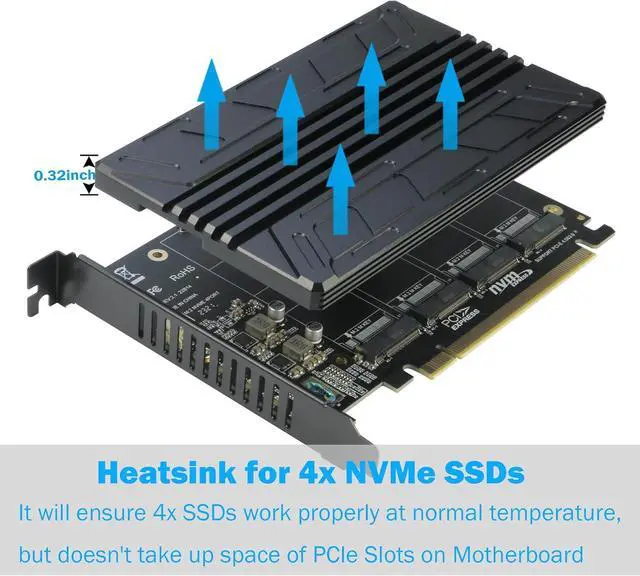 Upgraded Design: Designed with 0.32inch Heatsink, it will avoid SSDs working at low speed due to high Temperature, but it will not take up more space from other PCIe slots; And individual LED Indicator design will show each SSD's Working Status Compatible with M.2 PCI-e NVMe SSDs in all sizes:80x22mm, 60x22mm and 42x22mm, 30x22mm; Not support any M.2 (SATA-Based B+M Key) SSD; Motherboard Compatibility: Most Server and X299, X399 can support PCIe x16 Bifurcation