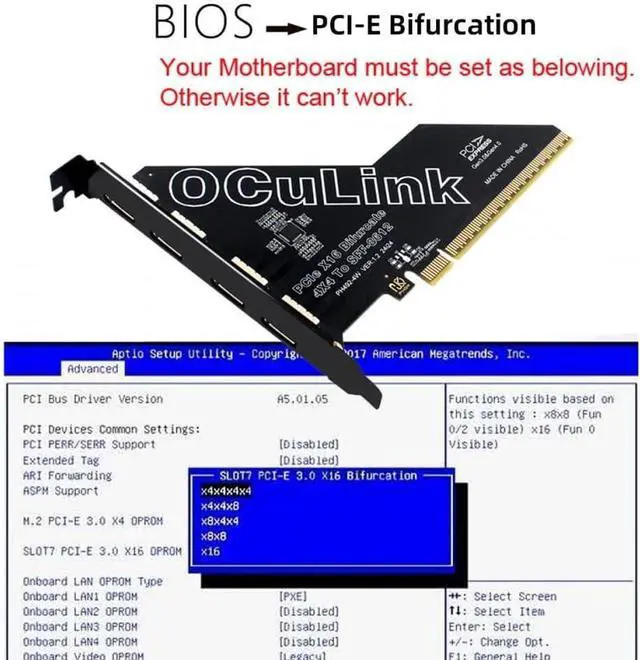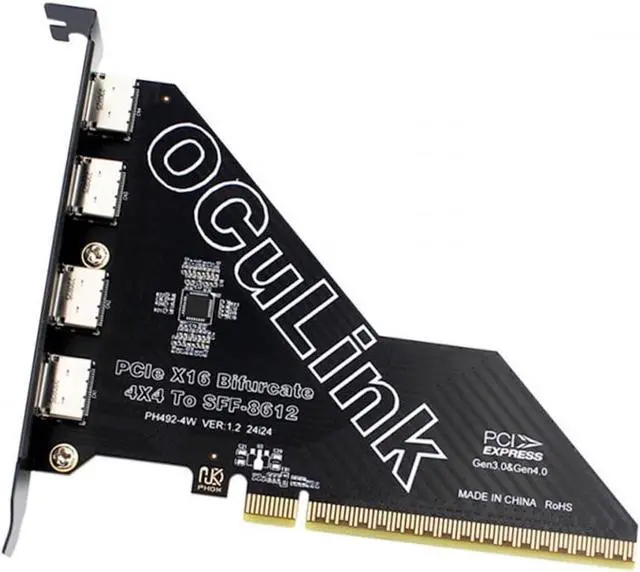 One detachable PCIE PCI-Express motherboard can be connected,The converter can be installed into the system internally through the oculink interface.Only supports motherboards with detachable PCI-E channels.Control the operation of four disks based on the motherboard PCIE channel,The motherboard without PCIE signal split can only recognize one disk.