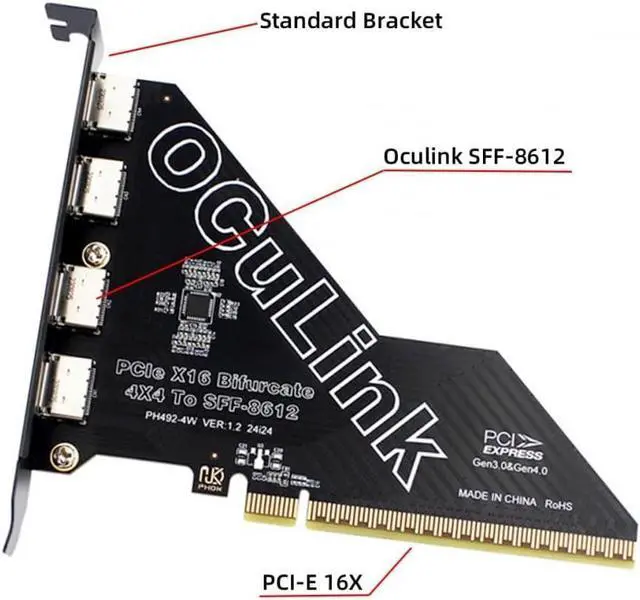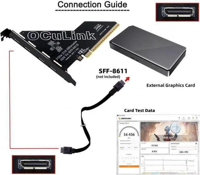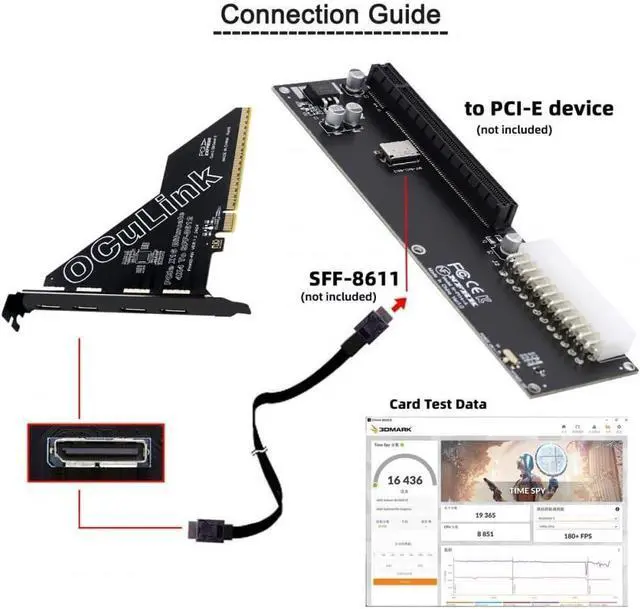 It can be connected e.g. one SSD or eGPU Graphics Card by using an optional cable. Suitable for small hosts, desktops, laptops, etc. to convert PCIE sockets to Oculink sockets, with fixing holes for fixing.It transmits PCI Express 4.0 signals using the PCIE protocol; Support PCIE 4.0 data transmission, Data transfer rate up to 64Gbps, Support connecting GPU graphics card, SSD, expansion card, etc., backward compatible with PCIE 3.0.