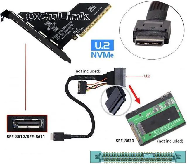 This PCI Express card expands the PC by one SFF-8612 interface, It can be connected e.g. one SSD/eGPU using an optional cable. The card transmits PCI Express signals using the PCIE4.0 protocol.Oculink is the next generation of high-speed internal and external I/O connectors for PCI-E, compatible with T10/ SAS-4 24 Gbps, SFF-8611, SFF-8612, PCIe Gen 3 and Gen 4.
