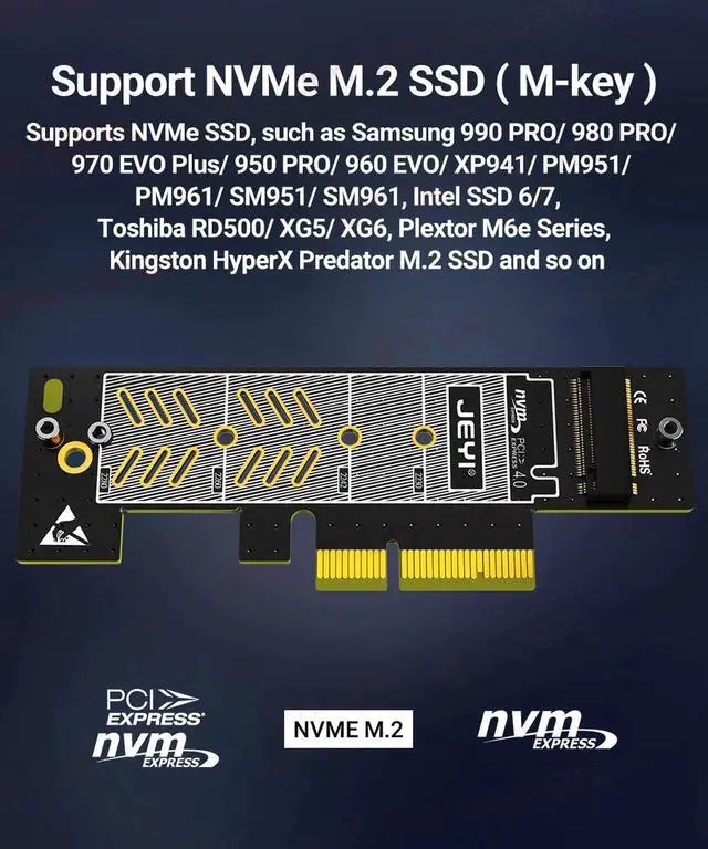 Support NVMe M.2 SSD (M-key):Samsung950PRO/960EVO/PM951/PM961/SM951/SM961/970EVO/970PRO/980PRO.-------Intel Optane SSD 800P Series, Intel SSD 760p Series, Intel SSD 660p Series, Intel SSD 600p Series.----------Toshiba OCZ RD400/Plextor M8PEG M6E/Kingston KC1000.