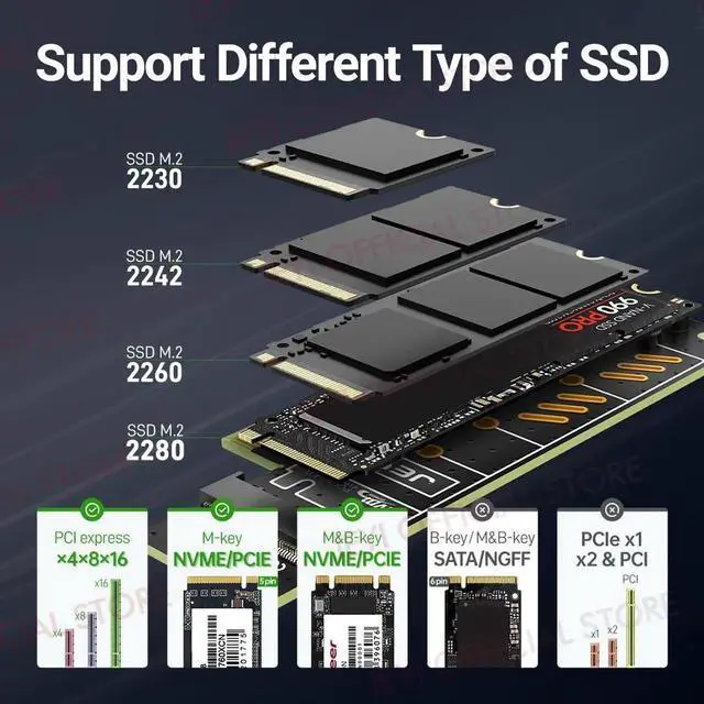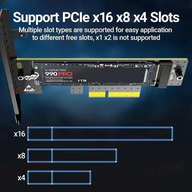 2. This PCIe NVMe Adapter support PCIe 4.0 NVMe SSD, backwards compatible with PCIe 3.0 2.0 1.0, 7000Mb/s Read and 6000Mb/s Write Max, support X4 X8 X16 slot.