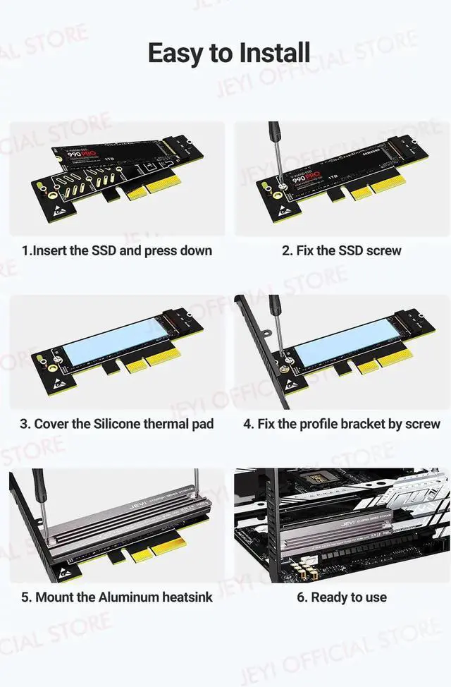 3. This NVMe PCIe Adapter card come with an aluminum SSD heatsink and thermal compound pad, and the adapter built-in a gold sink layer, all these methods to reduce the heat when SSD on high-load operation.