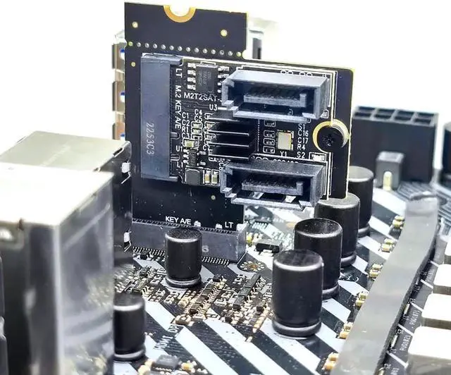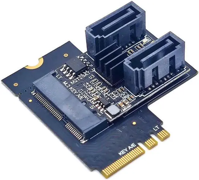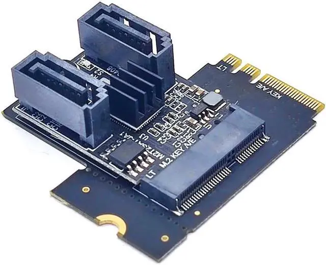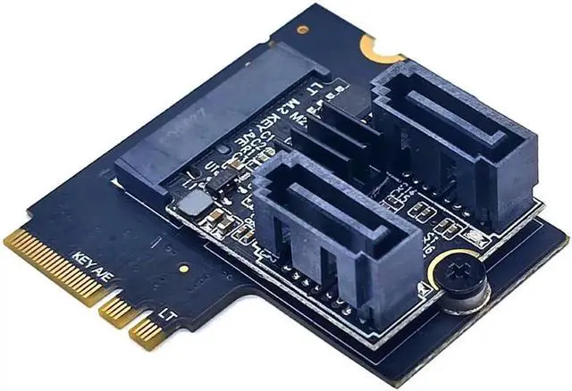 This adapter card can switch out 2 SATA interfaces through the M.2 (A+E Key) slot of the PC host, and the user can connect 2 SSD solid state drives or mechanical hard drives with SATA interfaces at the same time through the SATA data cable.