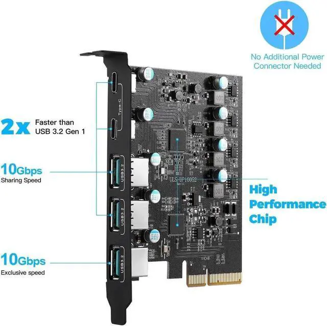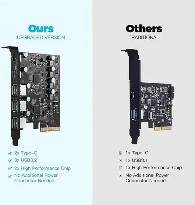 The PCI-E card is equipped with a bandwidth of 20 Gbit / s, which ensures fast data transfer and the real speed of USB 3.2 for the individual port. This expansion card is a necessity for external drives and perfect for file backups, video editing and data recovery (Note: the actual transfer speed can be limited by the connected device.