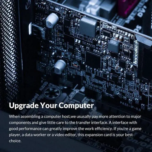 The PCI-E Card is equipped with 20Gbps bandwidth, which ensures fast data transmission, real speed of USB 3.2 for the individual port, this expansion card is a necessity for external drives and is ideal for file backups, video editing, and data recovery, and is backward compatible with USB 3. 0 and USB 2. 0 devices (Note: The actual transmission speed may be limited by the connected device, Thunderbolt 3 device connected to this expansion card is only compatible with 10G rate)