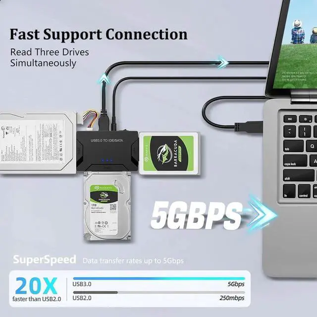 [Blazing-Fast SATA to USB Adapter Performance]: Equipped with USB 3.0 technology, the SATA to USB adapter delivers 5Gbps transfer speeds.