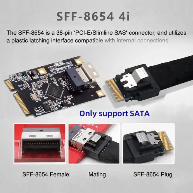The Slimline SFF-8654 4x connectors are internal small form factor for 4 SATA connectors and cables optimized for the client and market. (The adapter not work for any PCI-E/SAS device.)