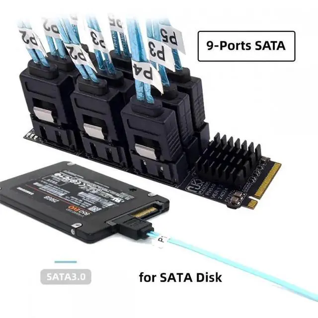NVMe to 9 SATA Adapter is designed for less SATA Ports but more spare M.2 NVMe Slots on Motherboard, This M.2 SATA Adapter will help you expand 9x regular SATA ports for storage appliances that use many SSDs and/or 3.5" hard drives