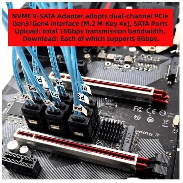 NVME 9 SATA Adapter adopts dual-channel PCIe Gen3/Gen4 interface (M.2 M-Key 4x), SATA Ports Upload: total of 16Gbps transmission bandwidth, Download: Each of which supports 6Gbps.