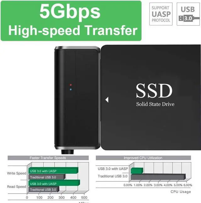 SUPER SPEED UP TO 5 Gbps with USAP: This external 3.5 SATA hard drive reader supports data transfer up to 5 Gbps. UASP support boosts read speeds by 70% and write speeds by 40%, making large file transfers a breeze by using this hard drive to USB adapter. Backward compatible with USB 2.0 / 1.1