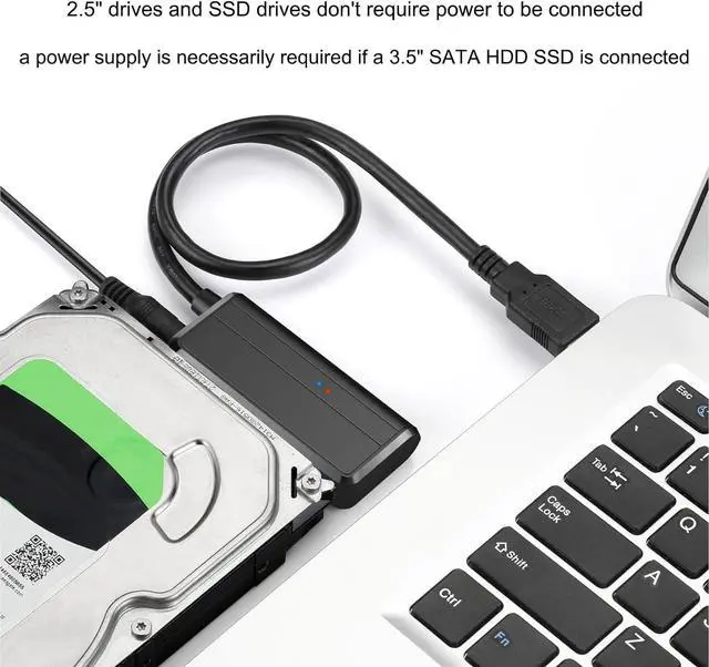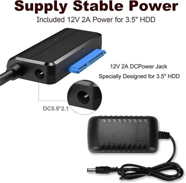 12V 2A POWER ADAPTER INCLUDED: This USB 3.0 to SATA adapter is equipped with a DC-Jack port and comes with a 12V/2A Power Adapter, which ensures enough power supply for a 3.5" hard drive, for a laptop (2.5") drive, or SSDs, you don't need the power
