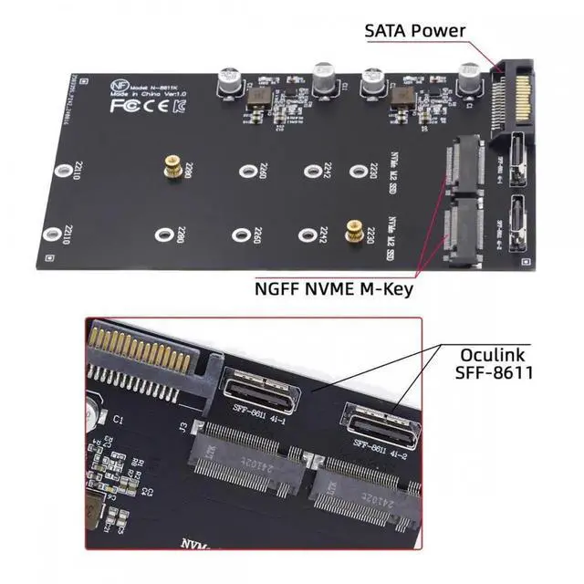 This M. 2 converter enables belowing applications: Dual M. 2 NVME PCIe SSD in 2280, 2260, 2242 and 2230 format can be connected, The converter can be installed into the system internally through Dual SFF-8611/8612 oculink interface. and the SATA power is required.