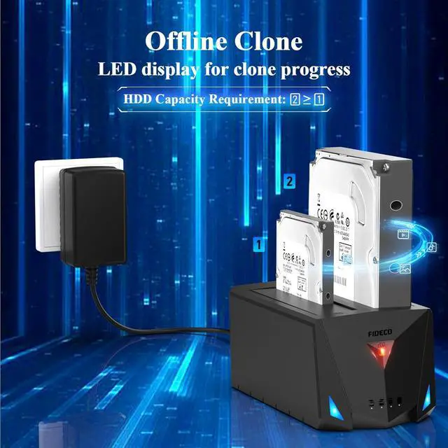 Offline CloneFIDECO HDD docking station can support offline clone. No computer is needed! Just insert 2 HDDs into the respective slots (Slot 1: Source Disk; Slot 2: Target Disk). Please note that the capacity of the target HDD needs to be equal to or larger than that of the source HDD.