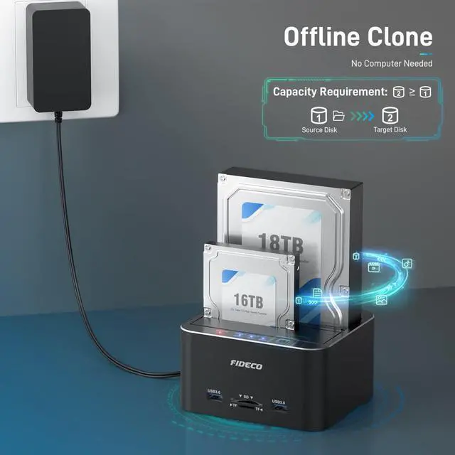 Offline CloneFIDECO HDD docking station can support offline clone. No computer is needed! Just insert 2 HDDs into the respective slots (Slot 1: Source Disk; Slot 2: Target Disk). Please note that the capacity of the target HDD needs to be equal to or larger than that of the source HDD.
